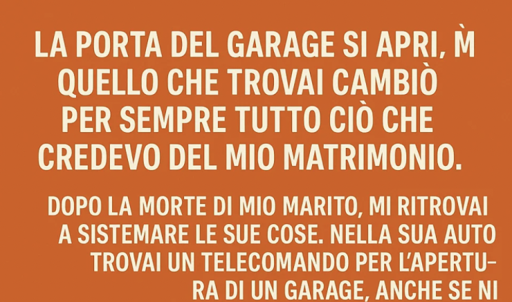 Dopo la morte di mio marito, mi ritrovai a sistemare le sue cose. Nella sua auto trovai un telecomando per l’apertura di un garage, anche se noi non ne avevamo uno che lo richiedesse. Incuriosita, iniziai a girare per il quartiere, premendo il pulsante lungo la strada. Funzionò davanti a un garage all’angolo. Il cuore mi batteva all’impazzata mentre la porta si sollevava lentamente, rivelando una vecchia bicicletta impolverata, un divano e una parete piena di foto incorniciate—alcune delle quali ritraevano proprio mio marito.