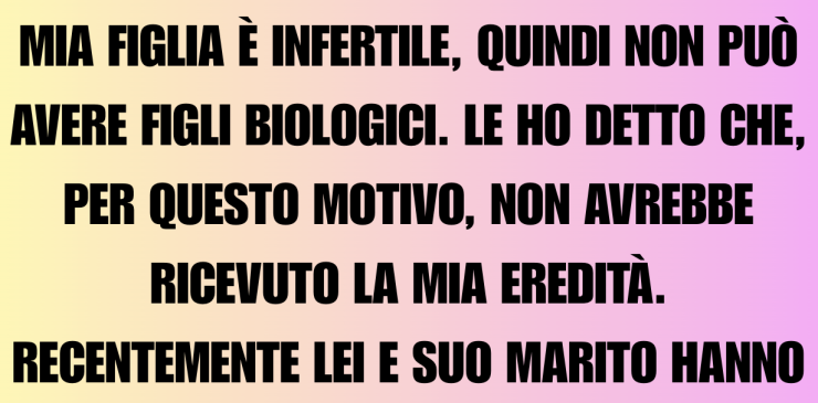 Mia figlia è infertile, quindi non può avere figli biologici. Le dissi che, per questo motivo, non avrebbe ricevuto la mia eredità. Di recente, lei e suo marito hanno adottato una bambina. Mia figlia mi chiese se questo contasse, e io risposi di no. Con mio grande orrore, una settimana dopo smisero di parlarmi.