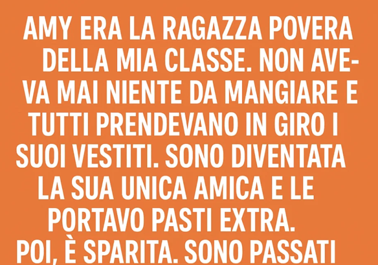 Amy era la ragazza povera della mia classe. Non aveva mai niente da mangiare e tutti prendevano in giro i suoi vestiti. Sono diventata la sua unica amica e le portavo pasti extra. Poi, è sparita.
