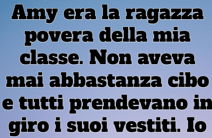 Amy era la ragazza povera della mia classe. Non aveva mai abbastanza cibo e tutti prendevano in giro i suoi vestiti. Io diventai il suo unico amico e iniziai a portarle pasti in più. Poi, all’improvviso, scomparve.