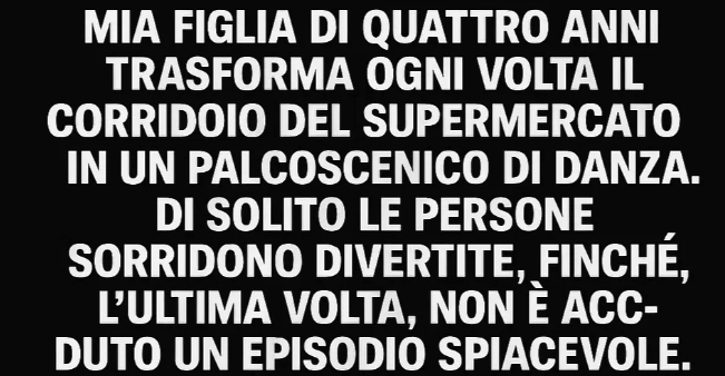 Mia figlia di quattro anni, ogni volta che siamo al supermercato, trasforma i corridoi in un palcoscenico di danza. Di solito la gente sorride, divertita, finché, l’ultima volta, non è successo qualcosa di diverso. Una donna anziana ci ha guardato con disapprovazione e ha detto: «Tua madre dovrebbe insegnarti un po’ di buone maniere».