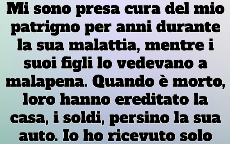 Ero seduta sul divano, la lettera premuta al petto, con le lacrime che mi rigavano il viso. Tutte quelle notti insonni, le visite mediche, pulirgli casa, imboccarlo quando non poteva muovere neanche un cucchiaio… lui l’aveva notato. Lui se ne ricordava. E, in qualche modo, quello contava più di una casa o di un’auto.