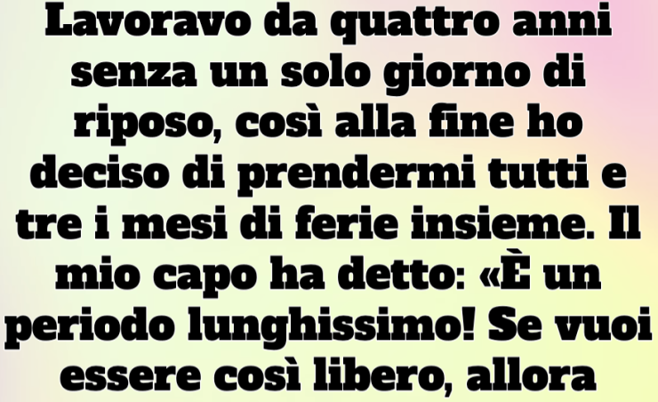 Lavoravo da quattro anni senza un solo giorno di riposo, così alla fine ho deciso di prendermi tutti e tre i mesi di ferie insieme. Il mio capo ha detto: «È un periodo lunghissimo! Se vuoi essere così libero, allora rassegna le dimissioni!»