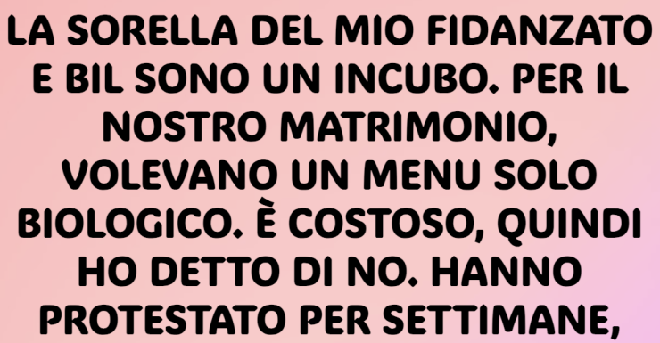 La sorella del mio fidanzato e mio cognato sono un incubo. Per il nostro matrimonio, volevano un menù solo biologico. È costoso, quindi ho detto di no. Hanno protestato per settimane, così alla fine li ho disinvitati. Mi hanno affrontato dicendo: “Te ne pentirai!” Il mio fidanzato non ha detto nulla ma ha continuato a guardare le scarpe.