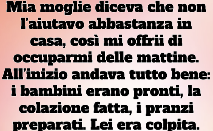Mia moglie diceva che non l’aiutavo abbastanza in casa, così mi offrii di occuparmi delle mattine. All’inizio andava tutto bene: i bambini erano pronti, la colazione fatta, i pranzi preparati. Lei era colpita. Ma un giorno vide una tazza da caffè sul bancone. Il suo sorriso svanì. Si voltò verso di me e disse: «Non hai finito, Alistair. Hai lasciato indietro l’ultima, la cosa più importante. Hai solo lasciato… la prova».