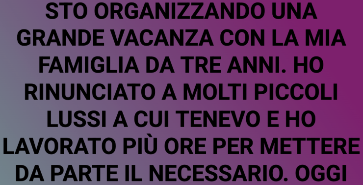 Da tre anni stavo pianificando una grande vacanza con la mia famiglia. Avevo rinunciato a molti lussi a cui tenevo e lavorato più del solito per mettere da parte abbastanza soldi. Quel giorno tornai a casa con il cuore pieno di entusiasmo, pronto a dire a tutti che finalmente si partiva… ma, appena varcata la porta, sentii mia moglie al telefono dire: