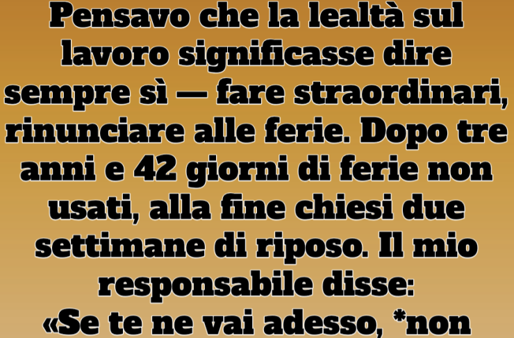 Pensavo che la lealtà sul lavoro significasse dire sempre sì — fare straordinari, rinunciare alle ferie. Dopo tre anni e 42 giorni di ferie non usati, alla fine chiesi due settimane di riposo. Il mio responsabile disse: