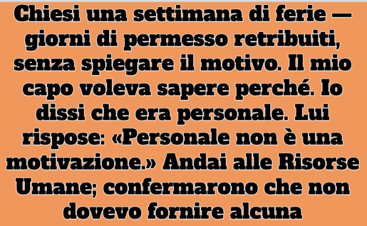 Chiesi una settimana di ferie — giorni di permesso retribuiti, senza spiegare il motivo. Il mio capo voleva sapere perché. Io dissi che era personale. Lui rispose: «Personale non è una motivazione.» Andai alle Risorse Umane; confermarono che non dovevo fornire alcuna motivazione. Poi mi inviarono l’email del mio capo in cui mi definiva “insubordinata” e “instabile”. Due settimane dopo, il signor Sterling, il mio capo, era improvvisamente sparito, e tutto il reparto era stato posto sotto un blocco aziendale obbligatorio e indefinito.