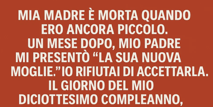 Mia madre morì quando ero ancora piccolo. Un mese dopo, mio padre mi presentò “la sua nuova moglie”. Io mi rifiutai di accettarla. Il giorno in cui compii diciotto anni, raccolsi le mie cose e me ne andai.
