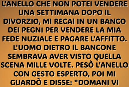 Il negozio, “Gold Rush”, era incastonato in uno scomodo angolo del centro, dove l’aria sapeva di vecchio metallo e rassegnazione. Stringevo l’anello nel palmo, sentendo il suo calore familiare sulla pelle, l’ultimo, penoso passo per ammettere la sconfitta economica. Sapevo che dovevo lasciarlo andare per tirare avanti il mese.