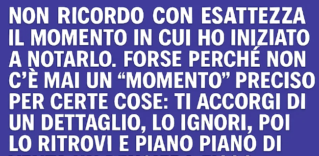 Non ricordo con esattezza il momento in cui ho iniziato a notarlo. Forse perché non c’è mai un “momento” preciso per certe cose: ti accorgi di un dettaglio, lo ignori, poi lo ritrovi, e piano piano diventa un pensiero fisso.