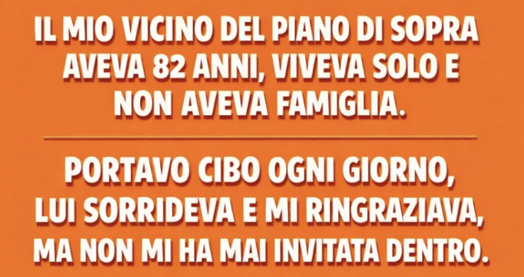 Il mio vicino del piano di sopra aveva 82 anni, viveva sola e non aveva famiglia. Nessuno nel palazzo la controllava mai. Ho iniziato a portarle del cibo ogni giorno. Lei sorrideva e mi ringraziava, ma non mi ha mai invitata dentro.