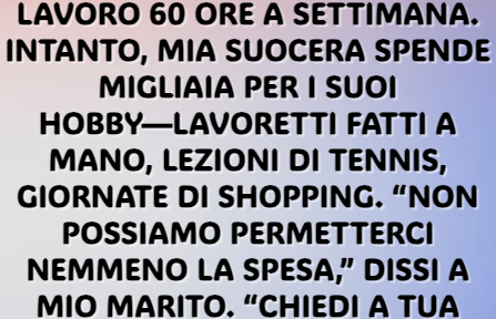 Lavoro 60 ore a settimana. Intanto, mia suocera spende migliaia per i suoi hobby—lavoretti fatti a mano, lezioni di tennis, giornate di shopping. “Non possiamo permetterci nemmeno la spesa,” dissi a mio marito. “Chiedi a tua madre una mano.”
