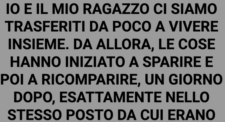 Io e il mio ragazzo ci siamo trasferiti da poco a vivere insieme. Da allora, le cose hanno cominciato a sparire, per poi ricomparire un giorno dopo, esattamente nello stesso posto da cui erano scomparse. Parlo di documenti, piccoli oggetti di casa, perfino del cibo. Così ho installato una telecamera nascosta, e quello che ho visto mi ha gelato il sangue.