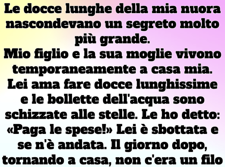 Mio figlio e la sua moglie vivono temporaneamente a casa mia. Lei ama fare docce lunghissime e le bollette dell’acqua sono schizzate alle stelle. Le ho detto: «Paga le spese!» Lei è sbottata e se n’è andata. Il giorno dopo, tornando a casa, non c’era un filo d’acqua. Attraverso la porta di vetro del bagno, ho visto la mia nuora con un uomo alto. Ridevano, completamente vestiti, sotto un getto d’acqua da un grosso secchio che aveva improvvisato.