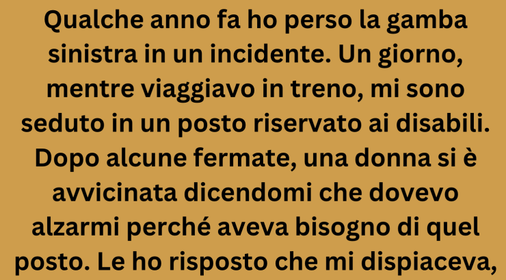 Qualche anno fa ho perso la gamba sinistra in un incidente. Un giorno, mentre viaggiavo in treno, mi sono seduto in un posto riservato ai disabili. Dopo alcune fermate, una donna si è avvicinata dicendomi che dovevo alzarmi perché ne aveva bisogno lei. Le risposi che mi dispiaceva, ma che avevo anch’io necessità di quel posto. Cominciò ad agitarsi in modo aggressivo. Mi sono nuovamente scusato, spiegandole che davvero ne avevo bisogno. Lei allora se n’è andata, ma è rimasta davanti a me, con le braccia conserte e lo sguardo accusatorio, quasi avessi commesso un crimine.
