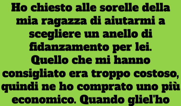 Ho chiesto alle sorelle della mia ragazza di aiutarmi a scegliere un anello di fidanzamento per lei. Quello che mi hanno consigliato era troppo costoso, quindi ne ho comprato uno più economico. Quando gliel’ho mostrato, mi hanno deriso, dicendo: “Si vergognerà a indossarlo!”. Più tardi, la mia ragazza mi ha chiamato, in lacrime, e ha detto di doversi vedere subito con me.