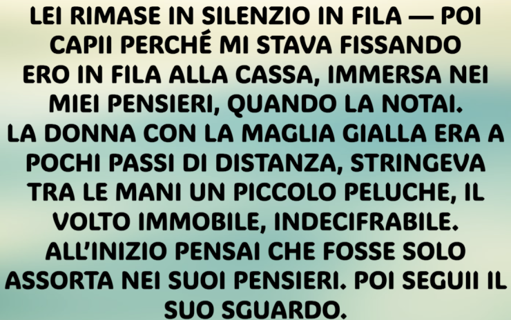 Il piccolo non doveva avere più di quattro anni. Capelli ricci e castani, lentiggini sparse sulle guance come costellazioni. La madre era intenta a svuotare il carrello sul nastro della cassa, mentre lui chiacchierava felice di qualche cartone animato di cui non avevo mai sentito parlare. Era una scena semplice, quotidiana — ma per la donna dietro di me significava molto di più.