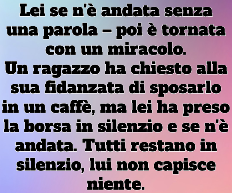 Un ragazzo ha chiesto alla sua fidanzata di sposarlo in un caffè, ma lei ha preso la borsa in silenzio e se n’è andata. Tutti restano in silenzio, lui non capisce niente.