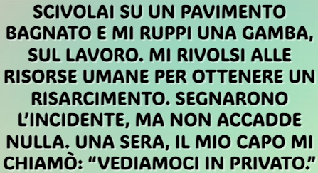 Scivolai su un pavimento bagnato e mi ruppi una gamba, sul lavoro. Mi rivolsi alle Risorse Umane per ottenere un risarcimento. Segnarono l’incidente, ma non accadde nulla. Una sera, il mio capo mi chiamò: “Vediamoci in privato.” Rimasi di ghiaccio quando scoprii cosa aveva inviato per email a tutto il personale prima dell’incontro: “Nessuna responsabilità sarà riconosciuta in merito all’incidente della signora Cartwright. Si ricorda a tutti di prestare attenzione e indossare calzature adeguate.”