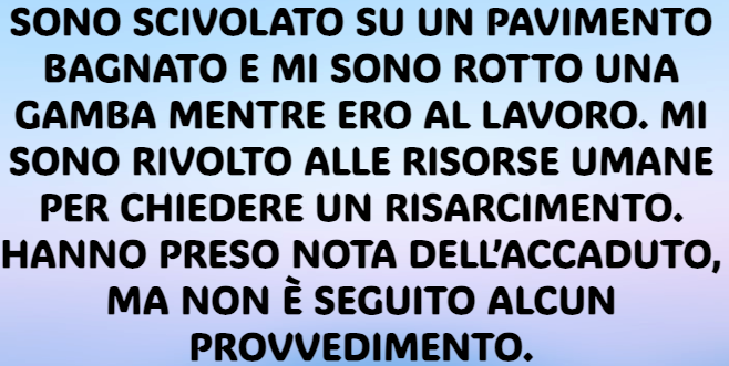 Sono scivolata su un pavimento bagnato e mi sono rotta una gamba mentre ero al lavoro. Mi sono rivolta alle Risorse Umane per chiedere un risarcimento. Hanno preso nota dell’incidente, ma non è successo nulla.