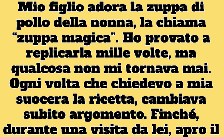 Mio figlio adora la zuppa di pollo della nonna, la chiama “zuppa magica”. Ho provato a replicarla mille volte, ma qualcosa non mi tornava mai. Ogni volta che chiedevo a mia suocera la ricetta, cambiava subito argomento. Finché, durante una visita da lei, apro il frigorifero e mi blocco: c’era un enorme contenitore di plastica industriale, non di avanzi o brodo fatto in casa, ma di un concentrato di pollo artigianale di altissima qualità, con un’etichetta seria e perfetta: “Master Stock Concentrate – Restaurant Grade.”