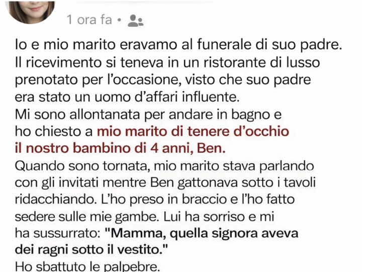 Mio figlio di quattro anni, Ben, non capiva la gravità della situazione. Per lui, la sala della reception era solo un altro posto nuovo da esplorare. Mentre ero distratta a parlare con dei parenti, si era infilato sotto i tavoli, ridacchiando in quel modo innocente che solo i bambini hanno — ignaro di tutto.