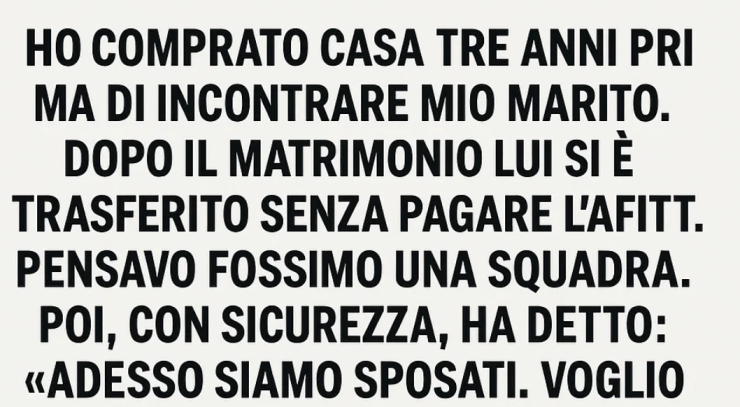 Ho comprato casa tre anni prima di conoscere mio marito. Dopo il matrimonio, lui si è trasferito senza pagare affitto. Pensavo fossimo una squadra. Poi, con sicurezza, ha detto: «Ora siamo sposati. Voglio che il mio nome sia sul rogito.»
