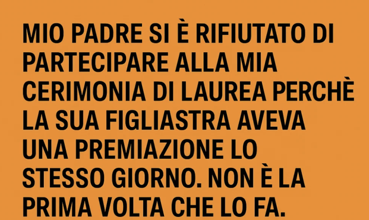 La verità è che non si trattava solo della laurea. Era solo l’ultima goccia di una lunga serie di occasioni in cui sono stata messa in secondo piano. Mio padre si è risposato quando avevo dodici anni. Ricordo benissimo quanto in fretta cambiò la sua attenzione. All’inizio mi ripetevo che era solo una mia impressione, che forse era difficile per lui gestire due famiglie. Ma alla fine divenne evidente: non ero più una priorità.