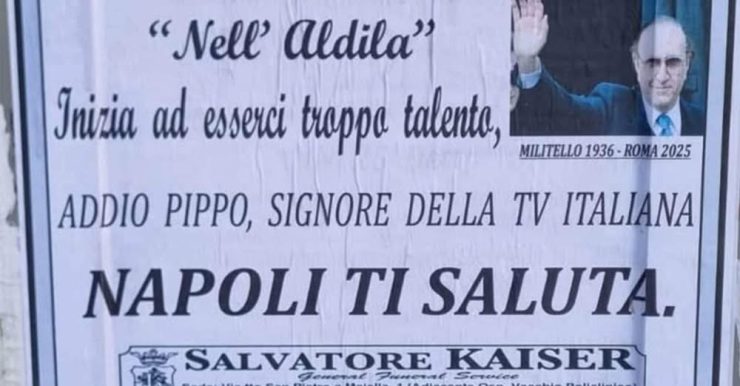 Pippo Baudo, celebre conduttore televisivo italiano, è al centro di un commovente tributo spontaneo affisso per le strade del centro storico di Napoli. Manifesti funebri, recanti la sua immagine e la frase “Nell’Aldilà inizia ad esserci troppo talento”, sono comparsi nella zona dei Decumani. Il testo esprime anche un saluto sentito della città: “Addio Pippo, signore della Tv italiana”. L’iniziativa è a cura della ditta di onoranze funebri Salvatore Kaiser, già nota per omaggi simili rivolti a personalità pubbliche