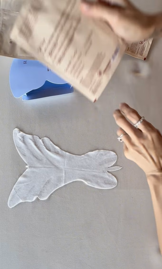 Una volta aperta, la maschera si presenta in tessuto bianco e conserva la forma di farfalla vista sulla confezione. La parte più ampia è progettata per essere posizionata sulla zona anteriore, mentre quella più stretta si adatta al fondoschiena. Ogni maschera è confezionata singolarmente per garantire massima igiene e prevenire contaminazioni da germi o batteri. Sul pacchetto sono riportati gli ingredienti e le istruzioni per l’uso.