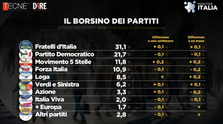 Forza Italia, al quarto posto, ha visto una diminuzione dello 0,2% nell’ultimo mese, portandosi al 10,9%, mentre la Lega, guidata da Matteo Salvini, rimane stabile all’8,5%, con un incremento dello 0,2% rispetto al mese scorso. Altri partiti seguono con Avs in leggero aumento al 6,2% (+0,1% in una settimana e sul mese), Azione al 3,3% (in calo dello 0,2% in un mese), Italia Viva al 2,0% (in lieve calo, -0,1% in un mese e nell’ultima settimana) e +Europa all’1,7%.