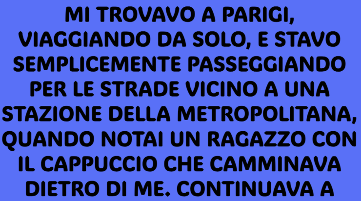 Ero a Parigi, viaggiando da solo. Passeggiavo senza meta per le strade vicino a una stazione della metropolitana, quando notai un ragazzo con il cappuccio che camminava dietro di me. Continuava a voltarsi, come se stesse controllando me. Prima ancora che potessi dargli peso, si affiancò di colpo e disse: «Idiota.»