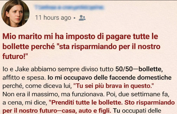 Per due giorni non riuscii a togliermi dalla testa le parole di Anna. Ripensavo al discorso di Jake sul “risparmiare per il futuro”, alle sue serate fuori, al telefono sempre nascosto, al modo in cui mi zittiva ogni volta che cercavo di parlarne. Tutto improvvisamente combaciava.