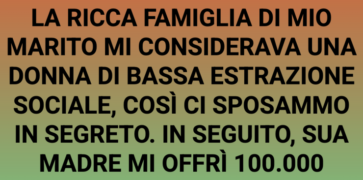 La famiglia benestante di mio marito mi considerava una donna di umili origini, così ci sposammo in segreto. Qualche tempo dopo, sua madre mi offrì 100.000 dollari per lasciarlo. Accettai, ma solo per darle una lezione. Quando arrivò nel luogo stabilito con il denaro, chiamai la polizia e dissi:
