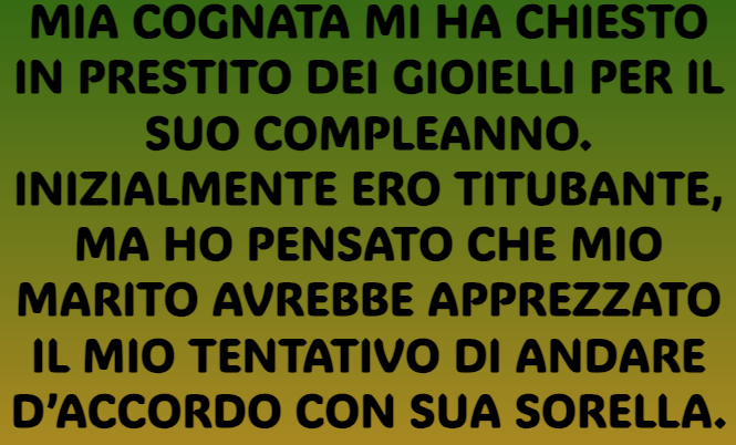 Mia cognata mi aveva chiesto in prestito dei gioielli per il suo compleanno. Ero riluttante, ma pensai che mio marito avrebbe apprezzato il mio tentativo di andare d’accordo con sua sorella. Tuttavia, quella sera rimasi scioccata nello scoprire che la mia collana era stata venduta.