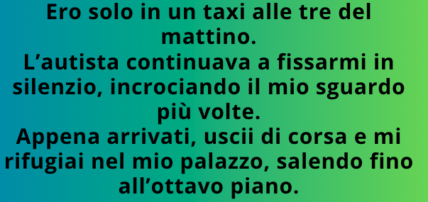 Ero sola in un taxi alle tre del mattino. L’autista continuava a fissarmi in silenzio, incrociando i miei occhi con insistenza. Appena arrivati, scesi di corsa e mi rifugiai nel mio palazzo, salendo velocemente all’ottavo piano. Poi sentii dei passi alle mie spalle: era lui. Il tassista.