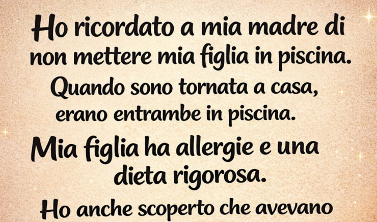 Ancora oggi mi si stringe lo stomaco ogni volta che ripenso a quel giorno. L’immagine è nitida come un film che non ho mai voluto girare: mia madre in piscina, nell’acqua bassa, che tiene per mano mia figlia mentre ridono insieme. Il sole riflesso sull’acqua, il viso felice e spensierato della mia bambina… e io ferma sulla soglia, con le buste della spesa ancora in mano, sentendo il cuore precipitare.