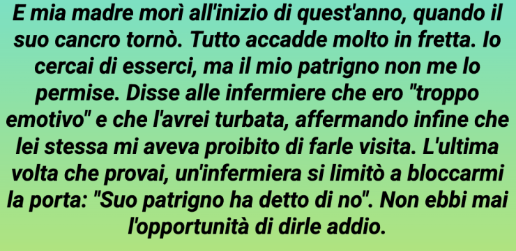 Mia madre morì all’inizio di quest’anno, quando il suo cancro tornò. Tutto accadde molto in fretta. Io cercai di esserci, ma il mio patrigno non me lo permise. Disse alle infermiere che ero “troppo emotivo” e che l’avrei turbata, affermando infine che lei stessa mi aveva proibito di farle visita. L’ultima volta che provai, un’infermiera si limitò a bloccarmi la porta: “Suo patrigno ha detto di no”. Non ebbi mai l’opportunità di dirle addio.