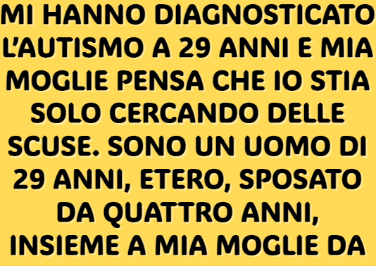 Sono un uomo di 29 anni, etero, sposato da quattro anni, insieme a mia moglie da sette. Due mesi fa ho ricevuto una diagnosi di autismo e mi sento ancora come se stessi tenendo in mano un filo scoperto. Non perché mi vergogni dell’autismo in sé, ma perché ha completamente riscritto il modo in cui guardo tutta la mia vita.