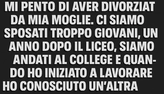 Ci siamo sposati troppo giovani, appena un anno dopo il liceo, e siamo andati all’università insieme. Quando ho iniziato a lavorare, ho conosciuto un’altra donna. Lei sapeva che ero sposato, ma mi ha posto una domanda: non mi ero mai pentito di essermi legato così presto? Ho esitato.