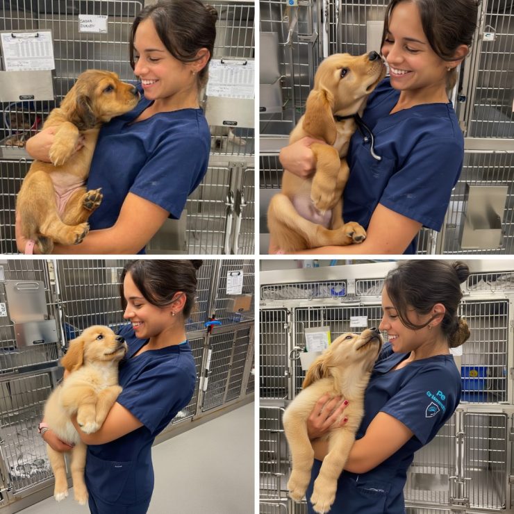 Mentre lo teneva tra le braccia, una collega ha scattato la foto. Un momento dolce, giusto? Ma se si ingrandisce l’immagine, si può leggere il nome scritto sulla lavagna bianca sopra la gabbia: