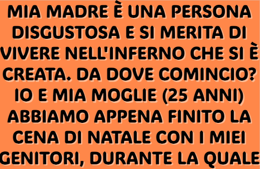 Da dove comincio? Io e mia moglie (25 anni) abbiamo appena finito la cena di Natale con i miei genitori, durante la quale abbiamo avuto un vero e proprio crollo nervoso pubblico.
