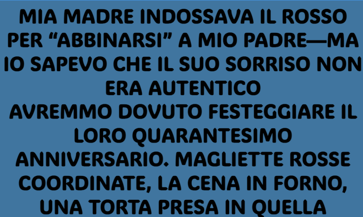 Ma io ho notato qualcosa che nessun altro ha visto. Il modo in cui mia madre giocherellava nervosamente con la collana. La tensione nel suo sorriso, che non le arrivava agli occhi. Mio padre scherzava e raccontava storie, ma lei quasi non ha parlato per tutta la cena.