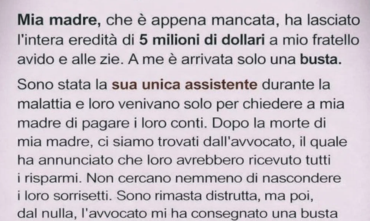 La stanza si riempì di sussurri e sorrisi trattenuti. Nessuno fece caso a me, se non il notaio, che mi porse la busta con un’espressione gentile.