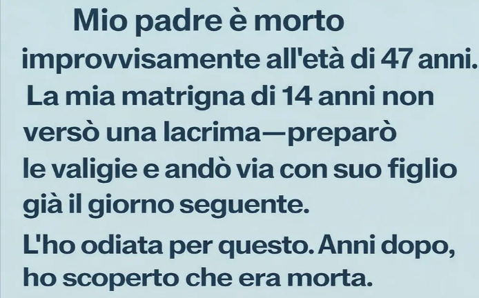 Mia matrigna, la donna che era stata al suo fianco per quattordici anni, non versò una lacrima.