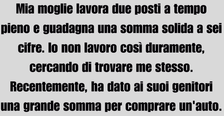 Recentemente, ha trasferito una grande somma di denaro ai suoi genitori affinché potessero comprare un’auto. Quando l’ho scoperto, ho provato una strana miscela di gelosia e rabbia che ribolliva dentro di me. I miei genitori, che hanno sempre lottato, non avevano ricevuto un centesimo da noi da quando ci siamo sposati. Vedere i suoi genitori improvvisamente premiati in quel modo mi è sembrato un tradimento.