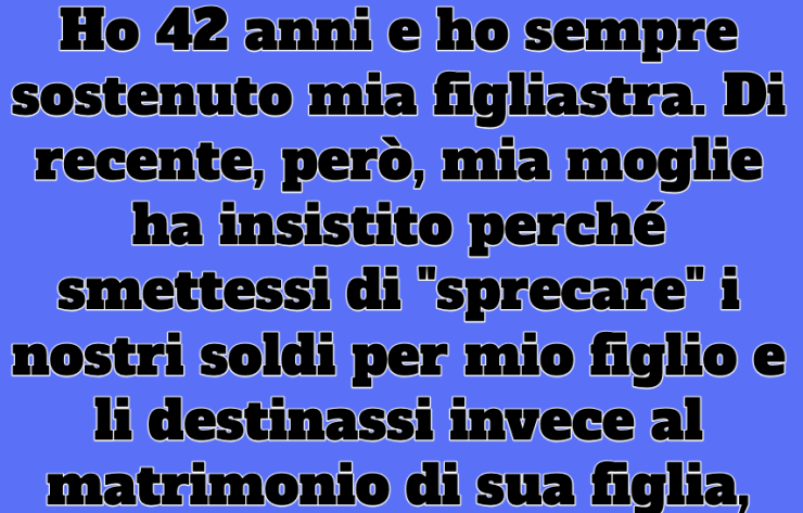 Ho 42 anni e ho sempre sostenuto mia figliastra. Di recente, però, mia moglie ha insistito perché smettessi di “sprecare” i nostri soldi per mio figlio e li destinassi invece al matrimonio di sua figlia, nonostante il padre biologico di lei sia benestante. Ha persino minacciato di annullare il nostro viaggio di anniversario in Italia se non fossi stato d’accordo.