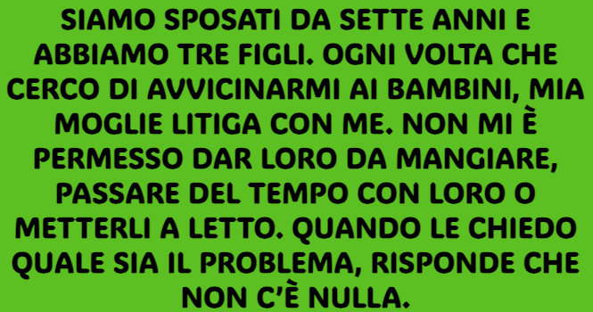 Siamo sposati da sette anni e abbiamo tre figli. Ogni volta che cerco di avvicinarmi a loro, mia moglie litiga con me. Non mi è permesso dar loro da mangiare, passare del tempo insieme o metterli a letto. Quando le chiedevo quale fosse il problema, rispondeva che non c’era nulla.