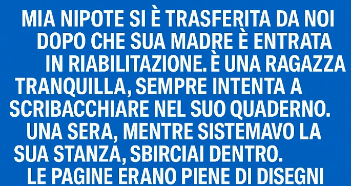 Mia nipote si è trasferita da me dopo che sua madre è entrata in riabilitazione. È una ragazza tranquilla, sempre intenta a scribacchiare nel suo quaderno. Una sera, mentre sistemavo la sua stanza, sbirciai dentro. Le pagine erano piene di disegni di una donna rinchiusa in un armadio. Chiesi con dolcezza: “È tua madre?” Lei mi fissò, poi sussurrò: “No… sei tu.” Risposi ridendo—fino a quando non mi girai verso l’ultima pagina e vidi me stessa disegnata con gli occhi barrati, e una data scritta sotto. Quella data era domani.